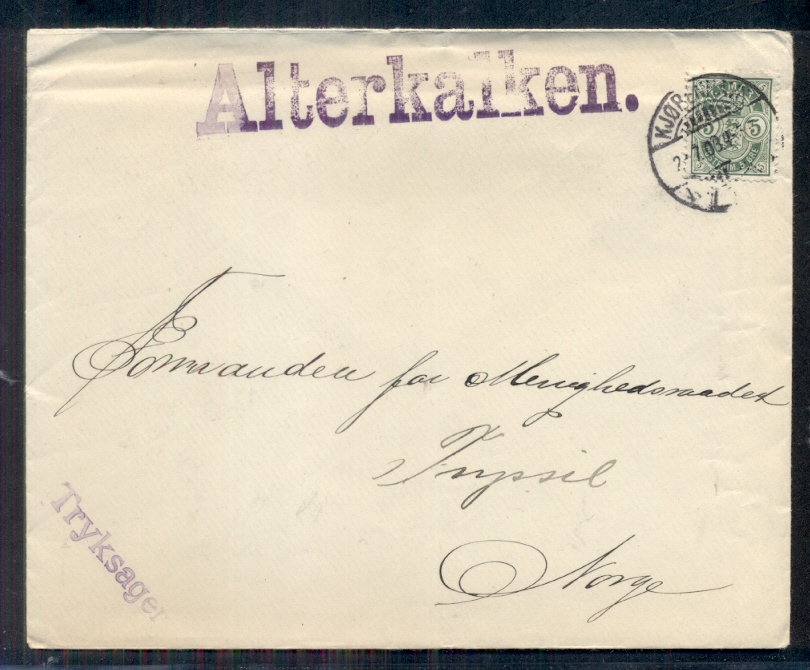 5ore tied on cover to Norway with bold ALTERKALKEN handstamp in purple,