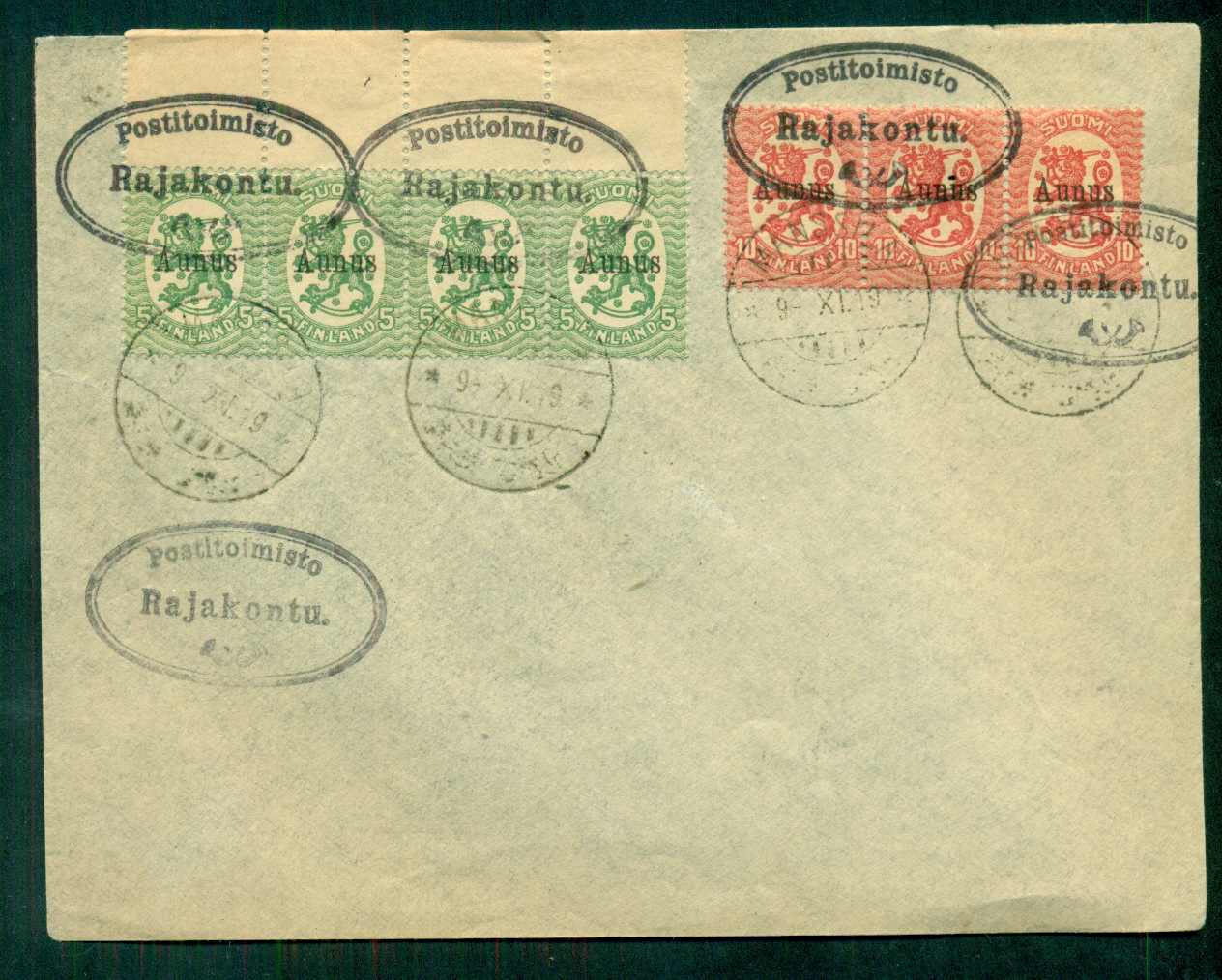 AUNUS, 1919, 5p & 10p Strips tied by oval RAJAKONTU cancels + town cancels on unaddressed cover, scarce and VF, $140.00 |