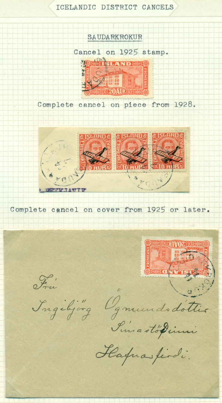 316MUA | SAUDARKROKUR, stamps, letter card and cover, on 2 Exhibit pages, VF, $170.00 | |