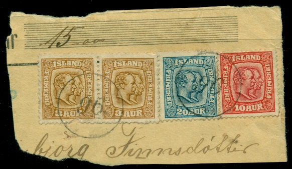 316QN | Iceland Numeral Cancel #96, multiple strikes on 3,10,20aur Two Kings on piece, nice item, $175.00 | |