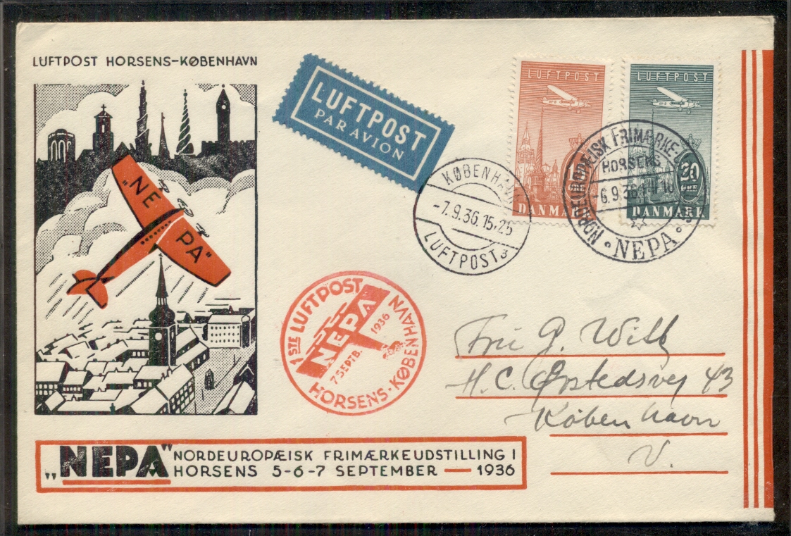 DENMARK, 1936, Airmails tied on pretty NEPA First flight cover, Horsens to Kobenhavn, pretty and VF, $28.00 |