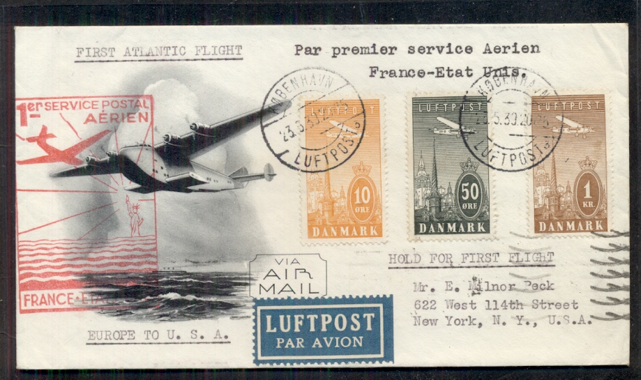 FRANCE 1939, Denmark Airmails tied on First Flight cover France to U.S., all proper markings, VF, $35.00 |