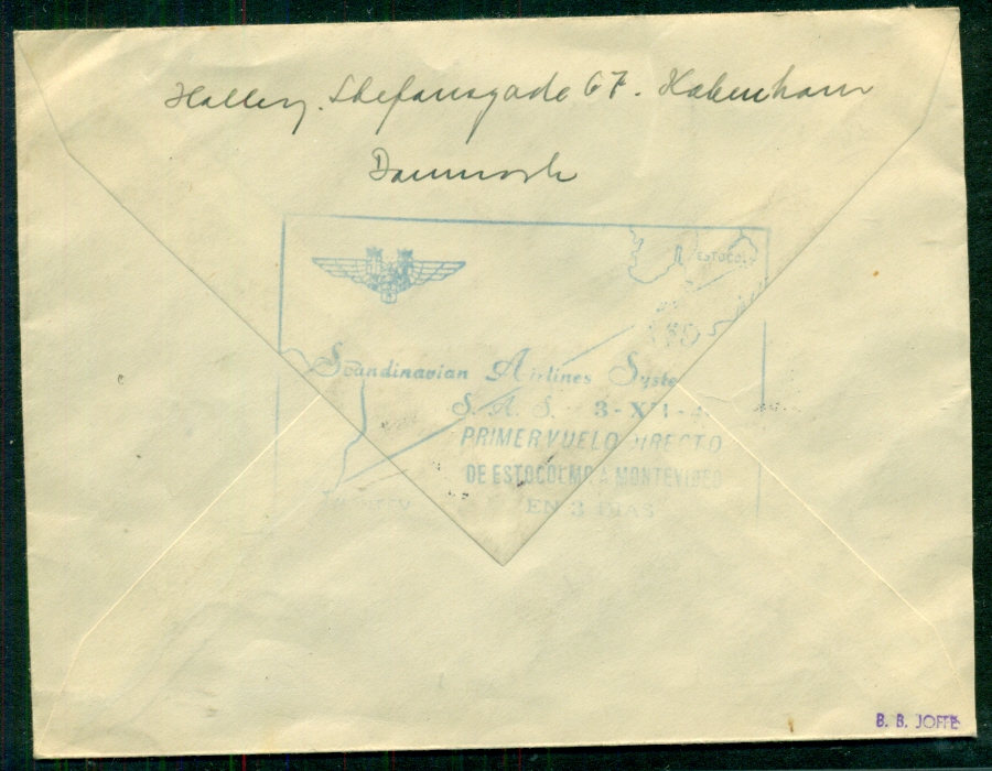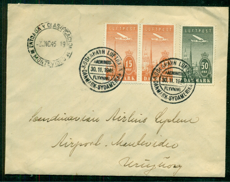 DENMARK, 1946, First flight cover to URUGUAY franked w/airmail stamps, VF, $35.00 |