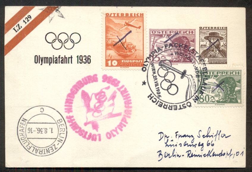 AUSTRIA, 1936, Hindenburg Olympic Flight cover w/multi franking tied by special Olympic cancel, quite scarce, VF, $350.00 |
