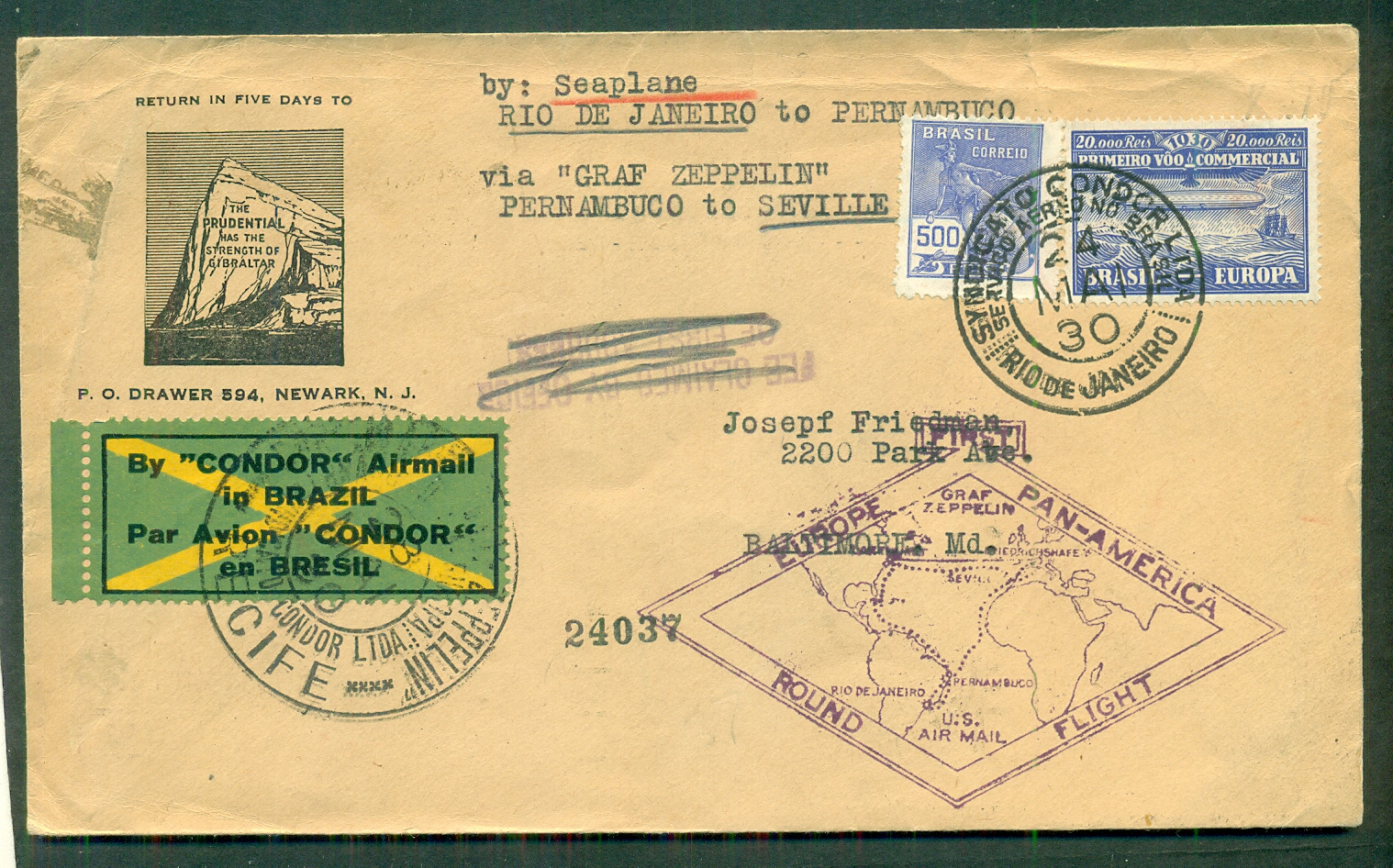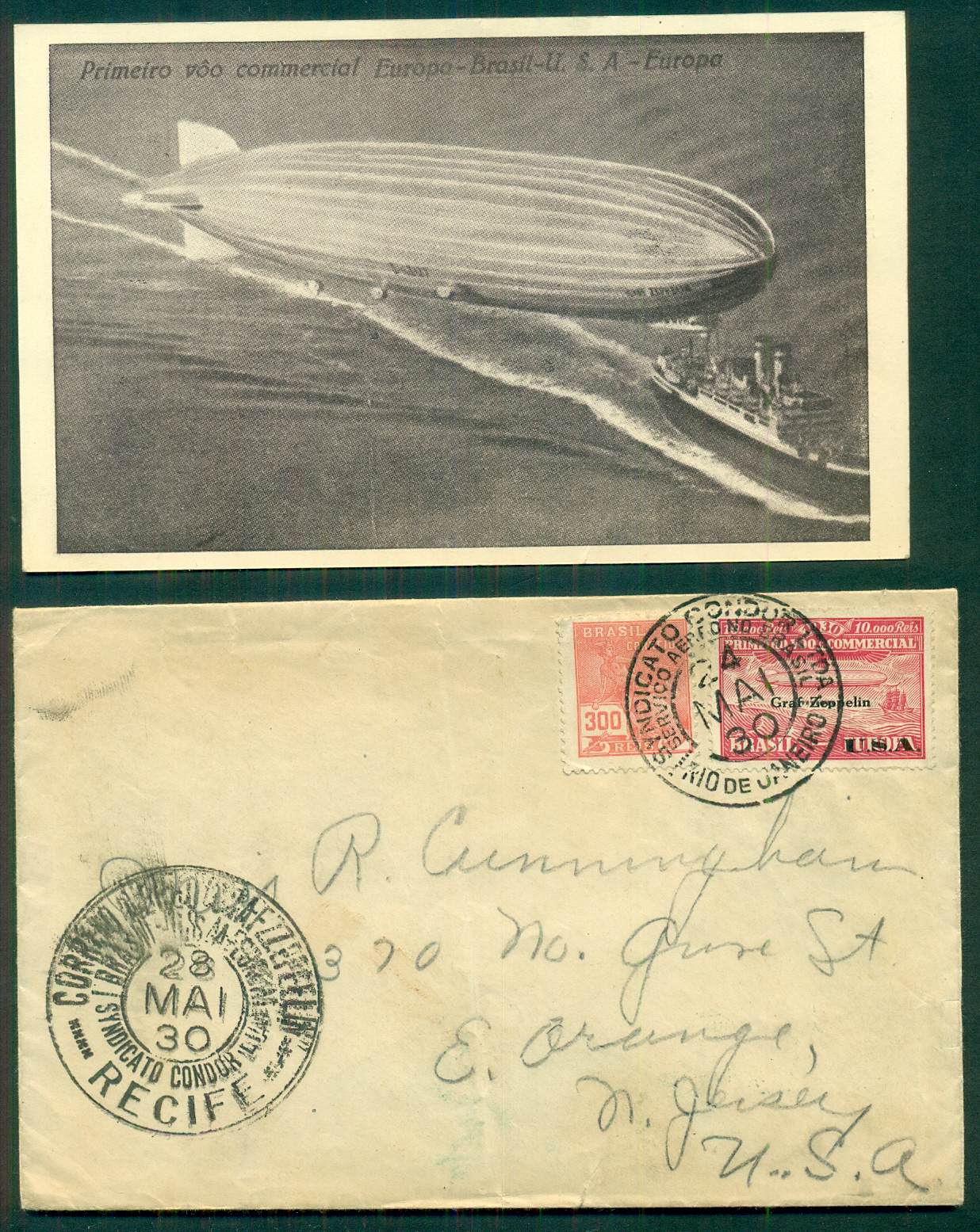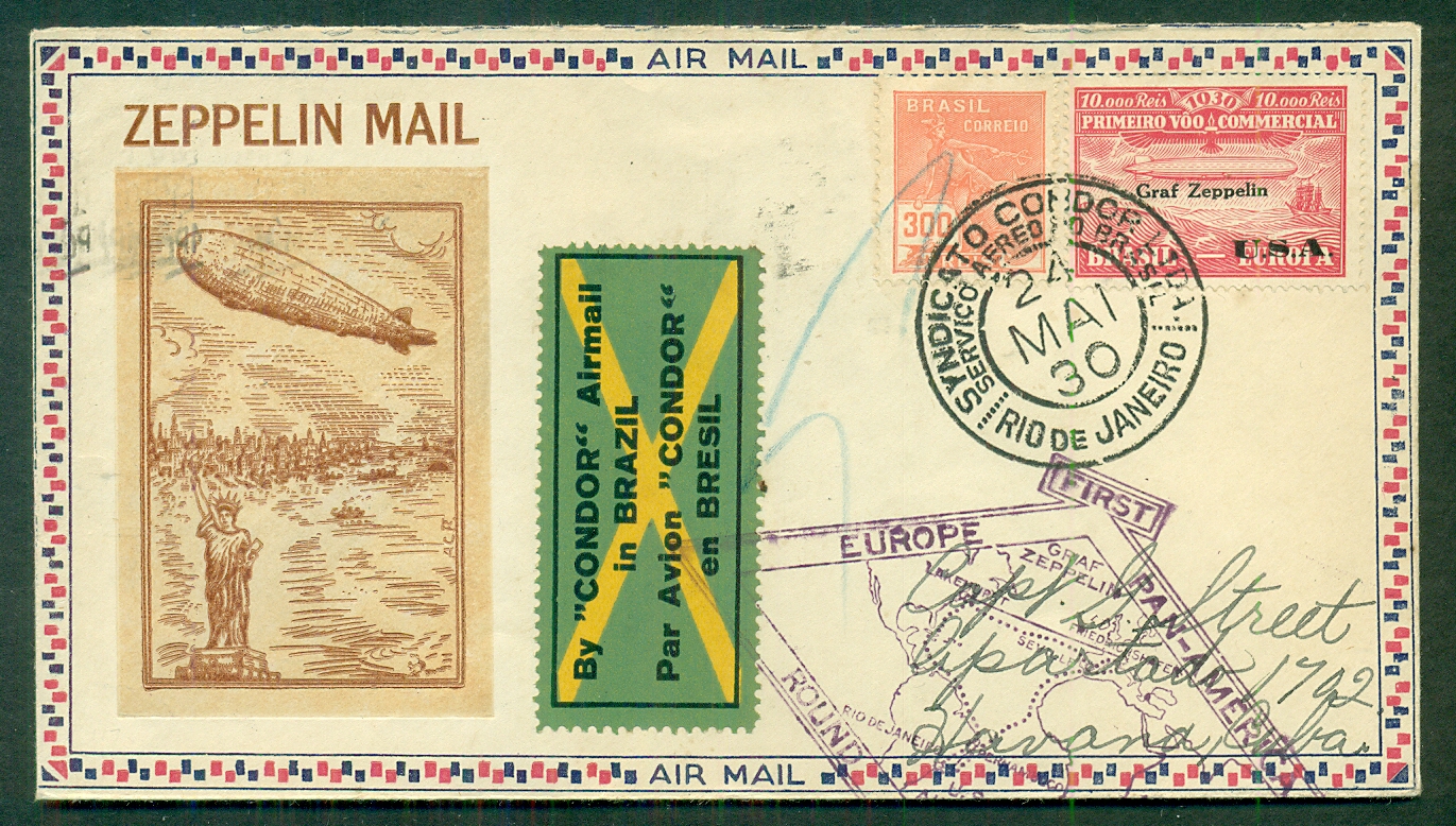 BRAZIL, 1930, Rio to Spain to NY Pan Am Zeppelin flight, 20,000 reis Zepp tied + Condor label w/Prudential advertising, pretty and scarcer, $220.00 |
