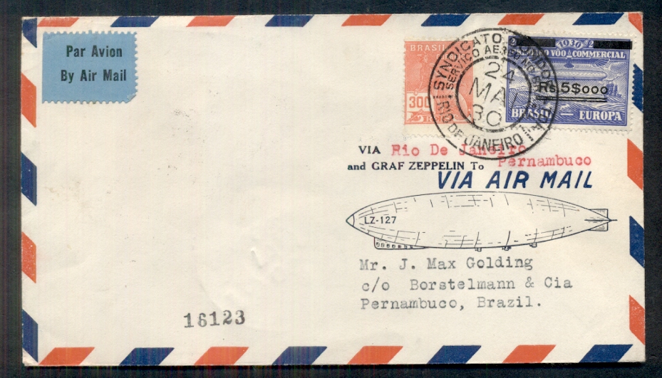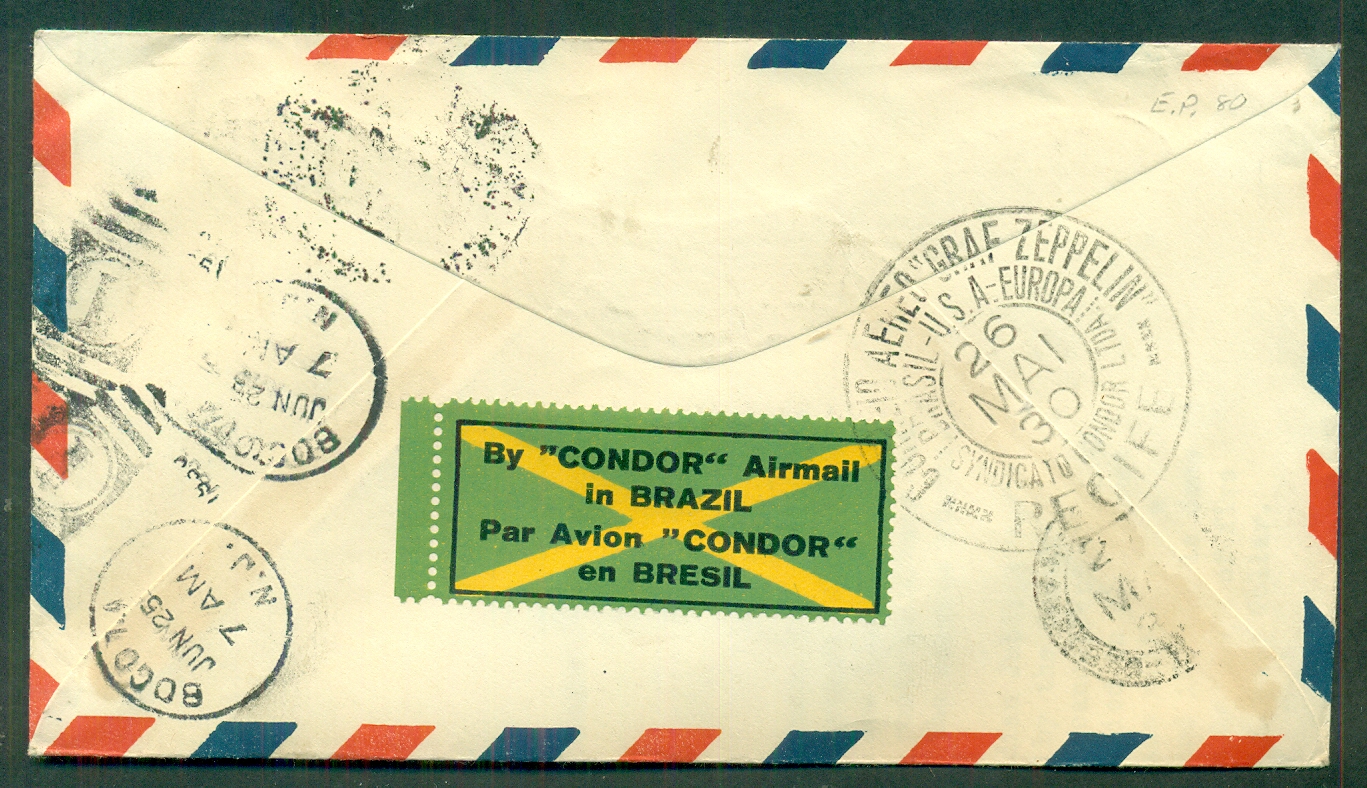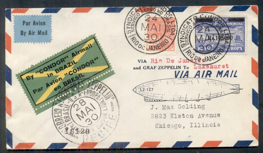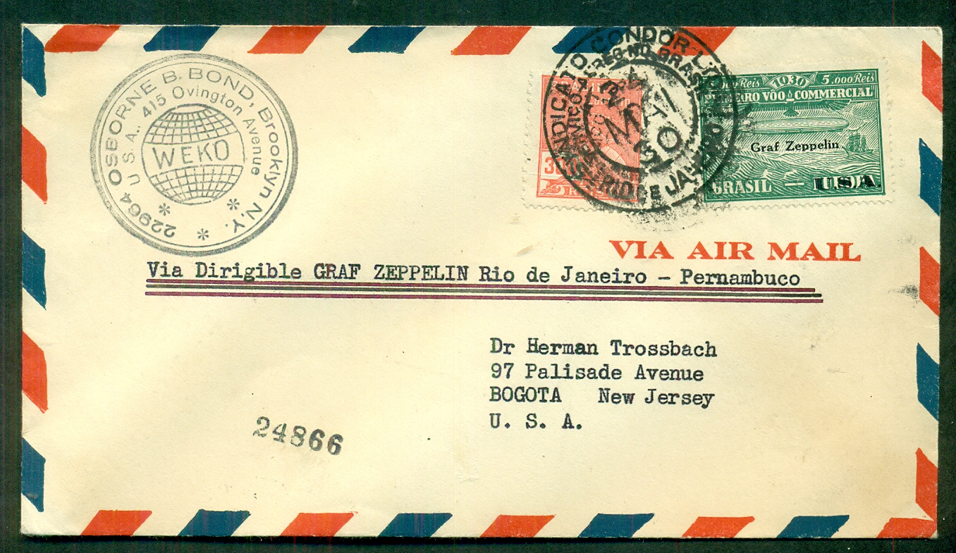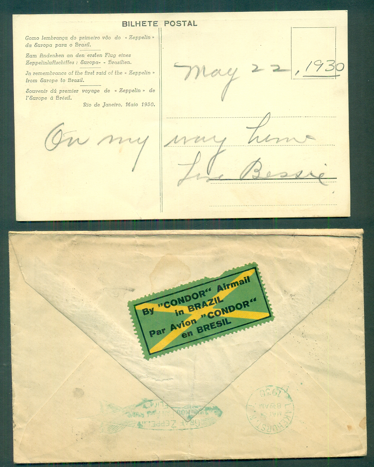 BRAZIL, 1930, Rio to Spain to NY Pan Am Zeppelin flight, 20,000 reis Zepp tied + Condor label w/Prudential advertising, pretty and scarcer, $220.00 |