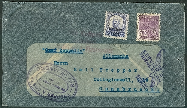 BRAZIL, 1930, Zeppelin Flight franked w/scarcer Scott #CL4 ($400.00), all proper markings, VF, $195.00 |