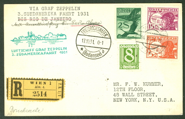 So. Amer Zeppelin Flight on registered card, multi franked w/cachet, VF,