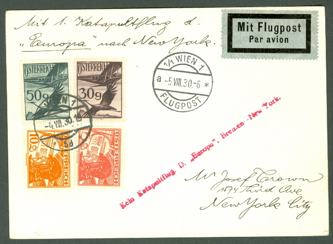 Flight via “Europa” to NY, red straight line cachet, multi franked, VF,