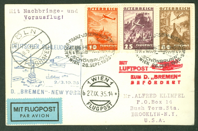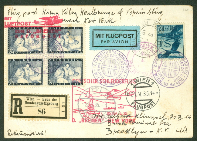 Flight via “Bremen” to NY on registered card, VF, scarce, $450.00 |