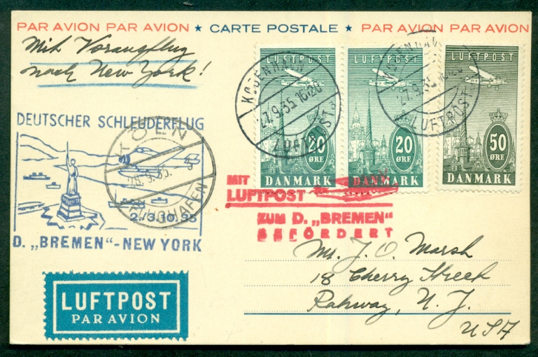 card via Bremen to NY, only 11 from Denmark flown, VF,$450.00 |