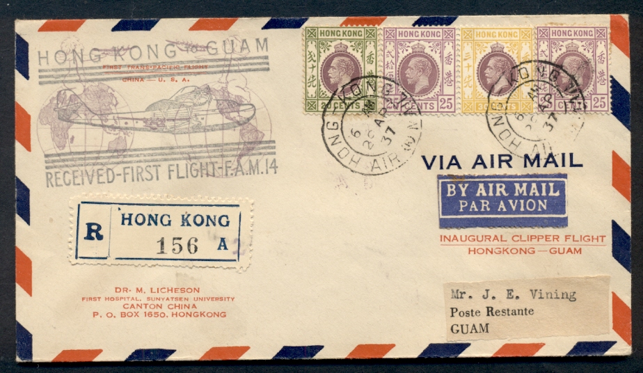HONG KONG, 1937, First Flight to Guam (bkstp), registered rate via Pan Am Clipper, 4 color franking, VF, $95.00 |