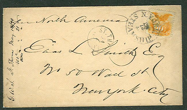 York, red St. Thomas A PAID and black “10”, VF, DWI Mails Price Guide