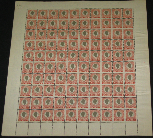 27 (25) 2Cents 1902 Ovpt on 3¢ Bicolor, Complete sheet of 100, og, NH, includes Normal Frame and Wedge Flaw major varieties plus other lesser varieties, sheet margin is separated at right and partially at bottom, Facit $2,800.00, $1,100.00 |