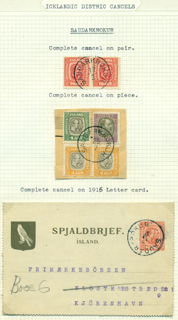 316MUA | SAUDARKROKUR, stamps, letter card and cover, on 2 Exhibit pages, VF, $170.00 | |
