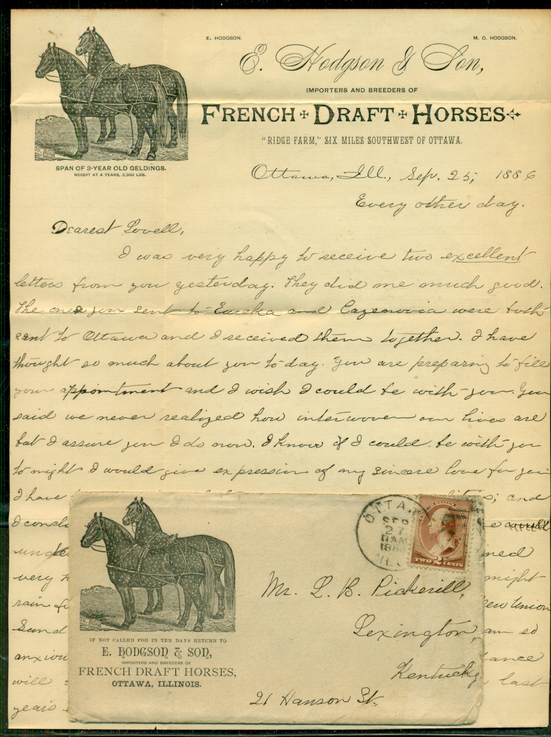 1898, G. Kirk – Harness Dealer advertising showing horse, horseshoe and roses, 2¢ tied Sharon PA, VF, $25.00 |