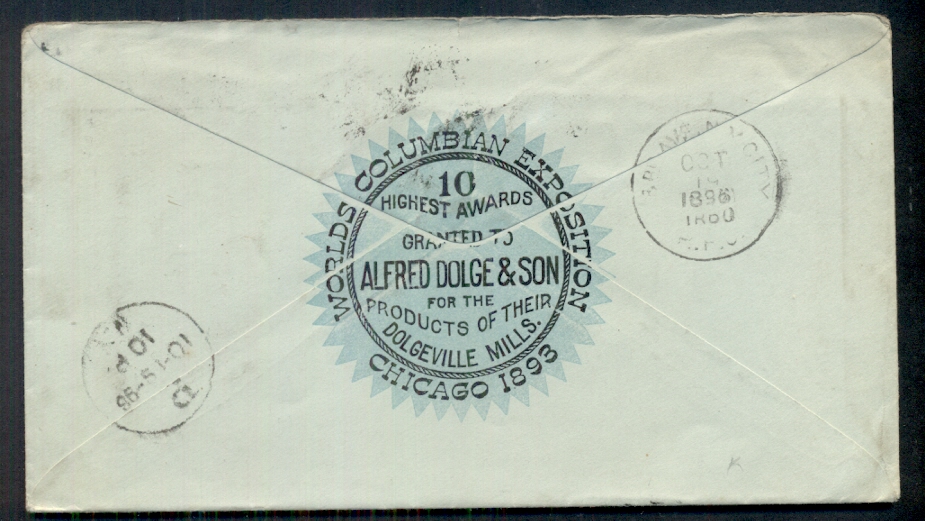 1896, Full front and back Map – Buffalo to NYC, very graphic plus “10 Awards Columbian Expo” for Dolge Autoharp, 2¢ tied w/flag cancel and 3rd Ave NY City R.P.O., scarcer and VF, $125.00 |