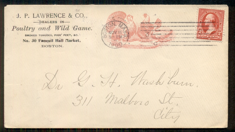 1900, J.P. Lawrence – Poultry & Wild Game advertising cover w/turkey, chicken, duck illustrated in red, 2¢ tied Boston Mass., VF, $40.00 |
