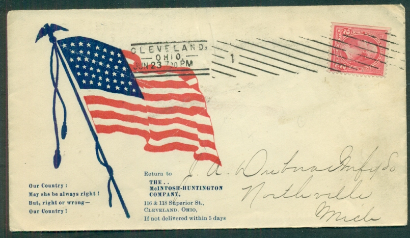 1899, 2¢ envelope tied by Bridgeport Conn Flag cancel with SAPOLIO Soap advertising, VF, $25.00 |