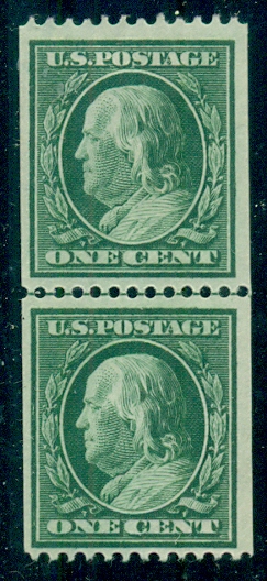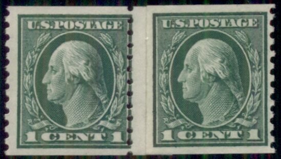 1¢ green, Coil Pair, og, NH, F/VF, Weiss certificate, Scott $225.00, $115.00 |