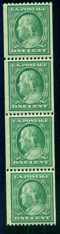 1¢ green, Coil Strip of 4, og, NH, VF, Weiss certificate, Scott $450.00, $225.00 |