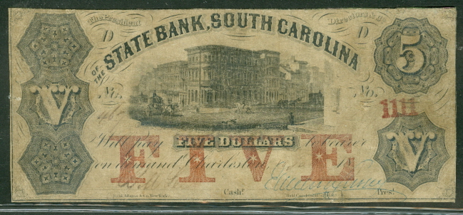 State Bank SC, $5 Bank Bldg, red FIVE, #1111 in red at right, Fine+,