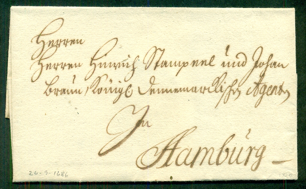 Schleswig Holstein (belonged to Denmark) 1686 prephilatelic cover to Hamburg, top quality, signed Pollak, VF, $125.00 |