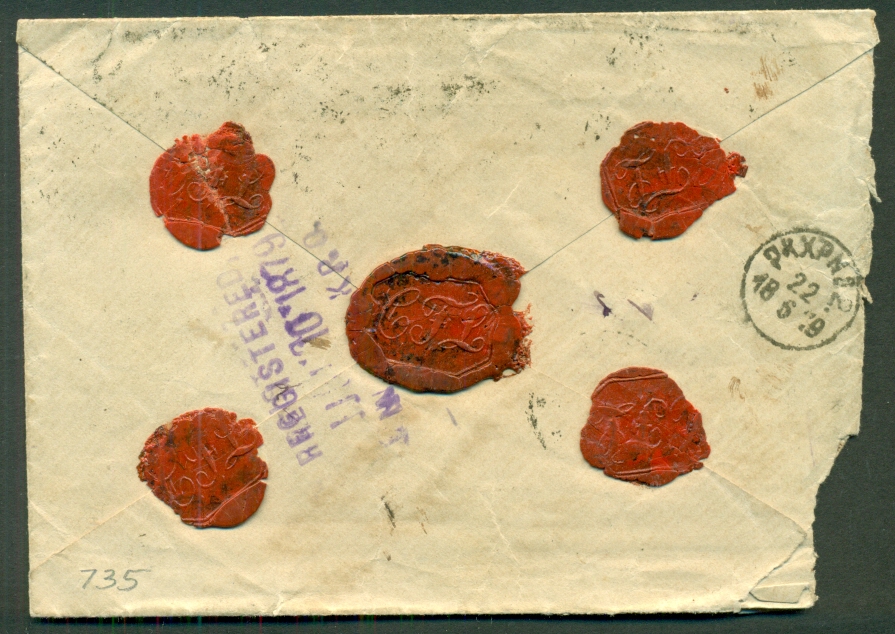 | 411ADA | 1879, Immigrant Mail turned cover made from previously received cover, franked w/30ore, 5ore+3ore = 380 registered rate, rough opening at left, five red wax seals and purple registry stamp reverse, $350.00 | ||