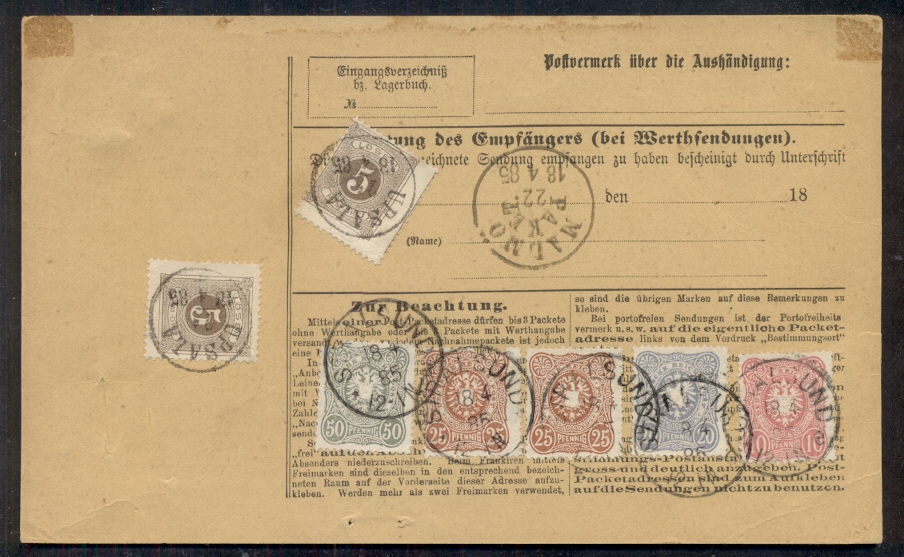 | 411AE | 1885, Sweden Postage Dues on Germany parcel card from Giessen to Upsala, very pretty multiple franking, VF, $225.00 | ||