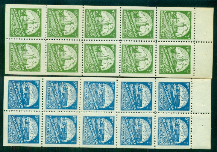 Group of 8 Booklet Panes of various Local stamps, incl (panes of 10 unless noted) Huskvarna 4ore brown bell tower, 50ore red and 75ore blue triangles (panes of 8), Stockholm Lokalforsaandelser 10ore dark blue, 4ore green, 8ore blue and 15ore red showing diff buildings, Sodertalje 8ore red, all NH, VF, $130.00 |
