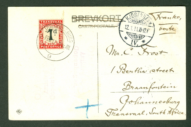 Kjobenhavn, Denmark with 5ore on front to South Africa, 1d postage due