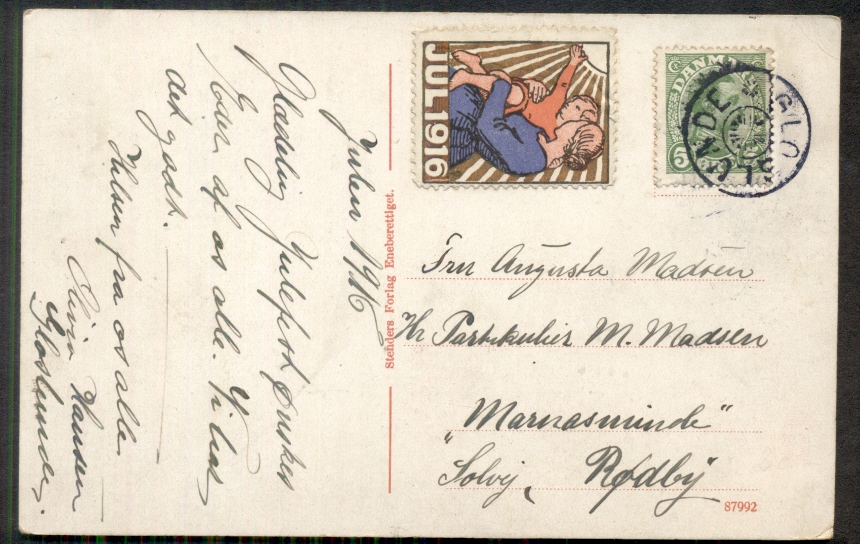 1916, GLOSLUNDE Star Cancel ties 5ore with Christmas Seal on color picture postcard, VF, $22.00 |