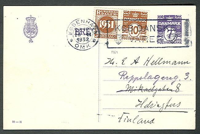 10ore 1931 RUNDSKVEDAGEN, Facit RE47 on card to Finland, $62.00 |