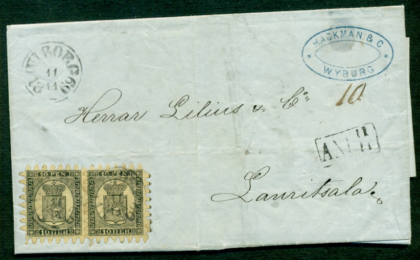 1869, 10p pair, roulette III (Scott 8), tied Wiborg on folded letter to Lauritsala, ANK arrival marking, beautiful example of this scarce usage,