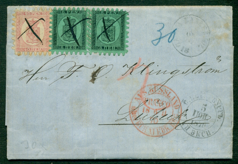 1865, Folded Letter from Bjornborg Finland via St. Petersburg w/bold red AUS RUSSLAND Railway postmark to Carlshutte in Holstein, VF, $210.00 |