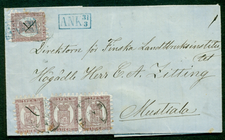 1868, 40pen roulette II full teeth tied by boxed RAUMO on cover to Latvia, VF, Facit $490.00, $250.00 |