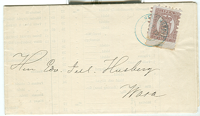 1874, 5p roul. II (Scott 12a) tied by blue Helsingfors on circular, bottom margin copy, attractive interesting printed matter rate, $525.00 |