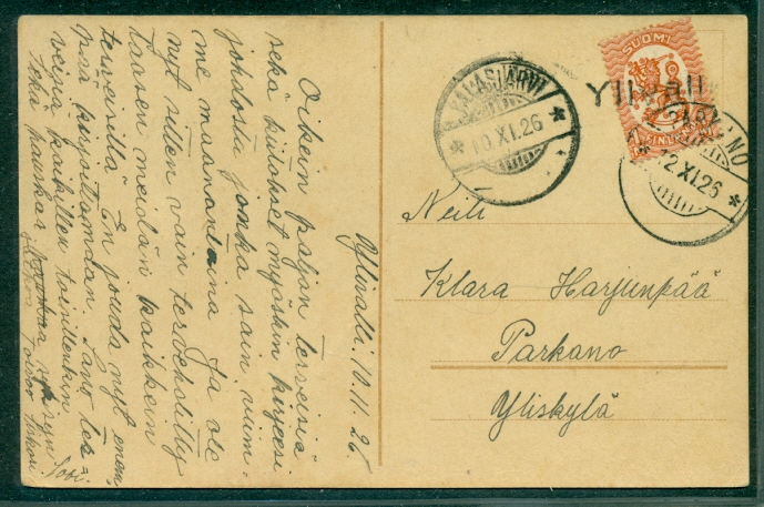 Village cancel YLIVALLI ties 1mk to postcard, VF, $24.00 |