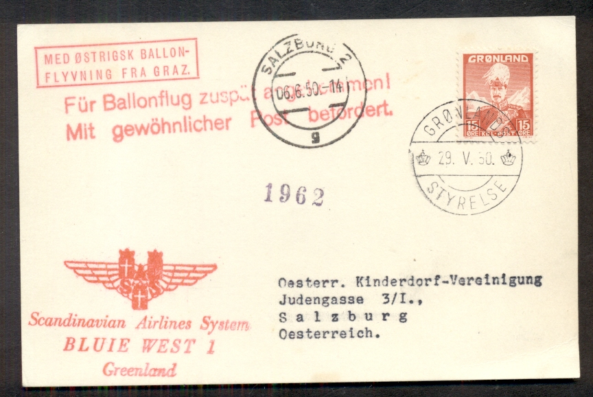 1950, BLUIE WEST I in combo with Austrian Balloon Flight, 15ore tied by Gronlands Styrelse (Wow. 600kr), VF and scarce, $75.00 |