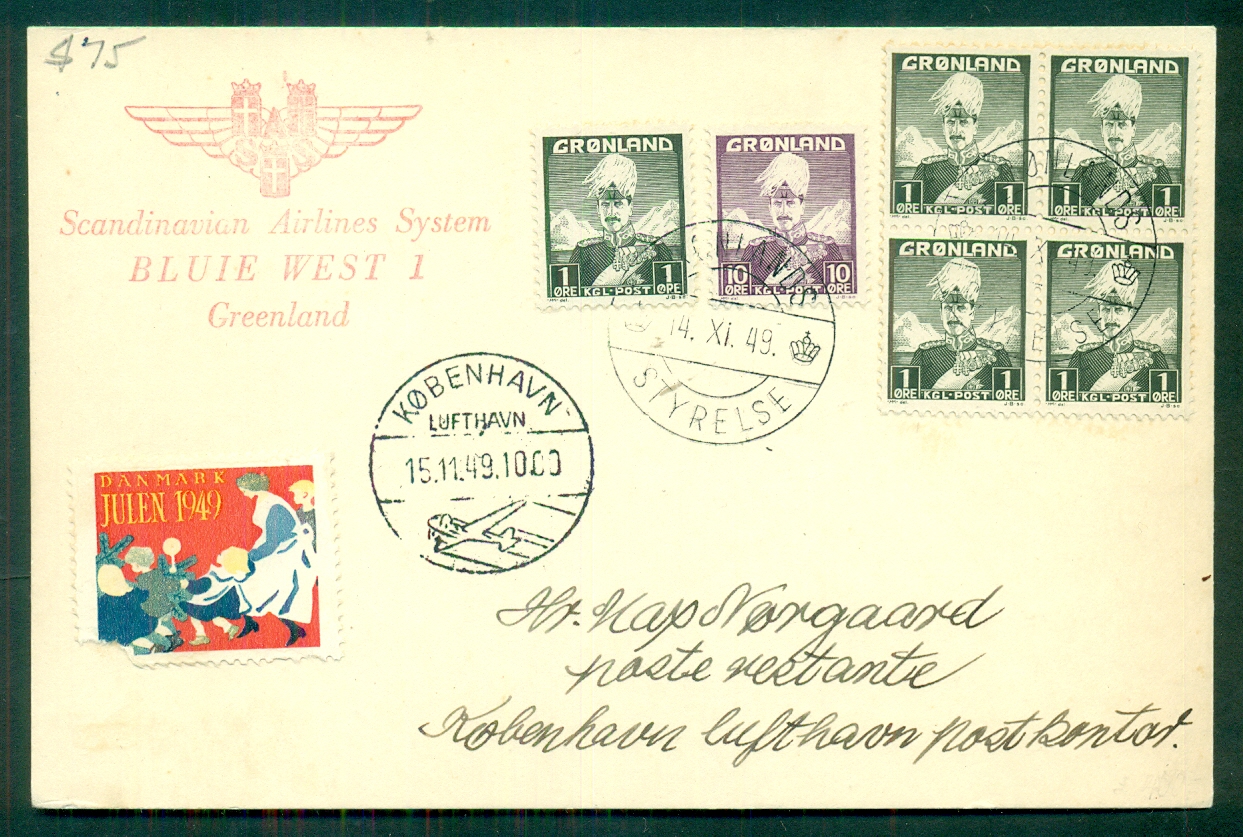 1949, BLUIE WEST I early flight card to Denmark, proper red handstamp, scarcer and VF, $55.00 |