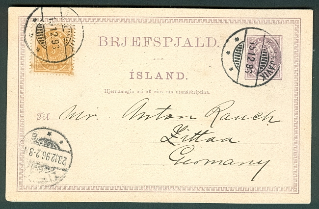 1886, 8aur card + 3aur (Scott 15) tied Reykjavik plus boxed SHIP LETTER to Germany, message reverse, scarce ship mail, VF, $1,200.00 |