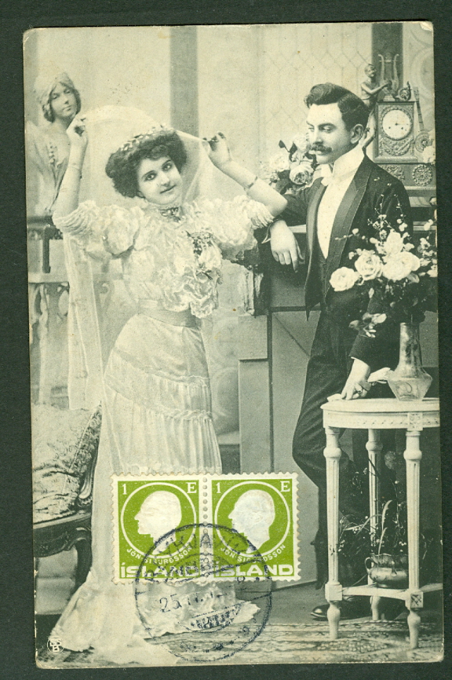 1912, Postcard w/1e + 1e pair tied Reykjavik local use, wedding scene