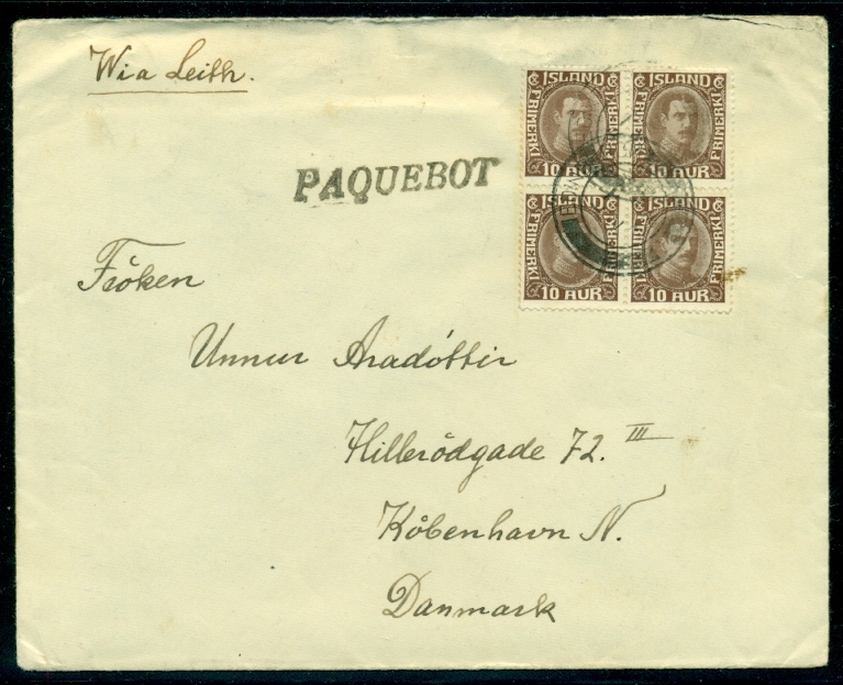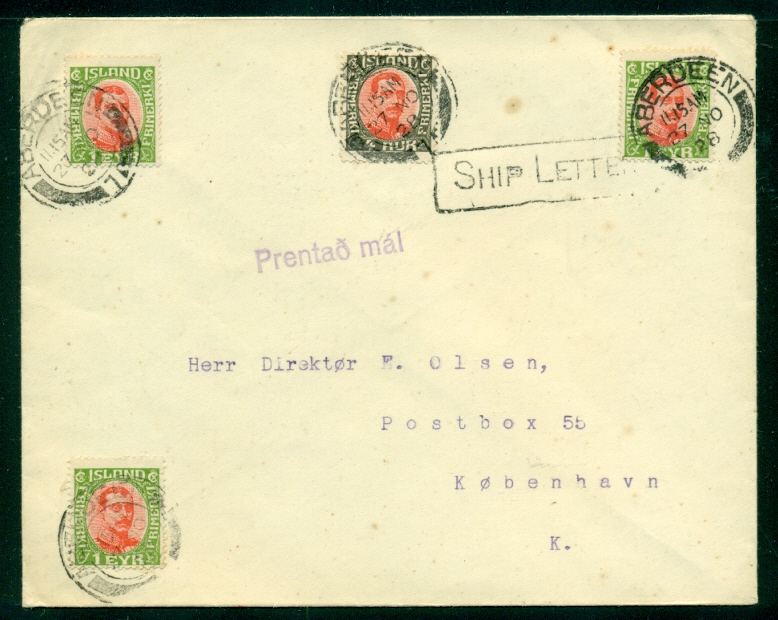 Denmark w/arrival cds on front as well as purple "ISLAND" handstamp,
