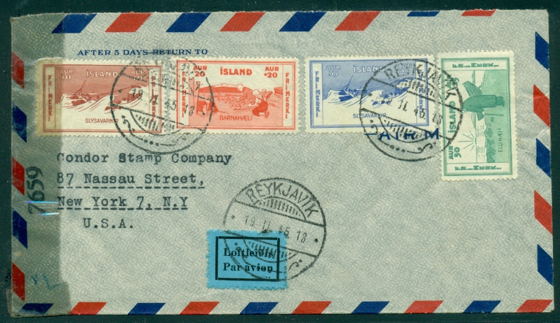 1947, Semi Postals (x5) + 50aur Fish tied on Airmail cover to U.S., semi-postals much scarcer usage, VF, Facit 1300kr, $65.00 |