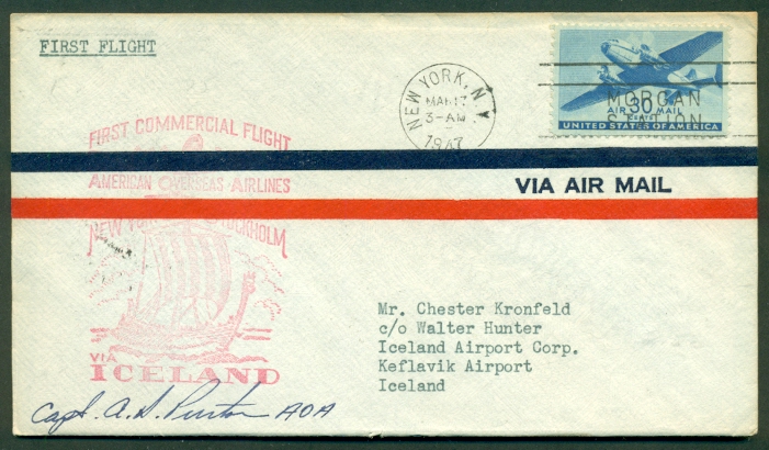 First Flight U.S. – Stockholm VIA ICELAND, proper cachet with transit