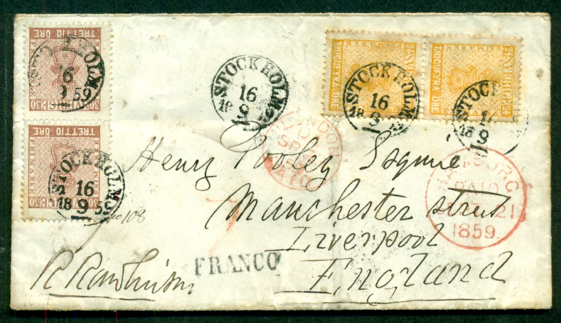 | 410P | 1859, 108ore rated cover to England via Germany, 24ore x2 + 30ore x2 (Scott 10,11) tied Stockholm + various transits, scarce, Facit $1,210.00, $575.00 | ||
