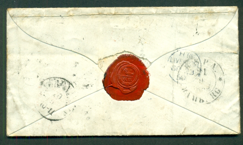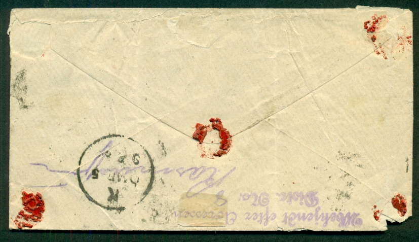 | 411ADA | 1879, Immigrant Mail turned cover made from previously received cover, franked w/30ore, 5ore+3ore = 380 registered rate, rough opening at left, five red wax seals and purple registry stamp reverse, $350.00 | ||