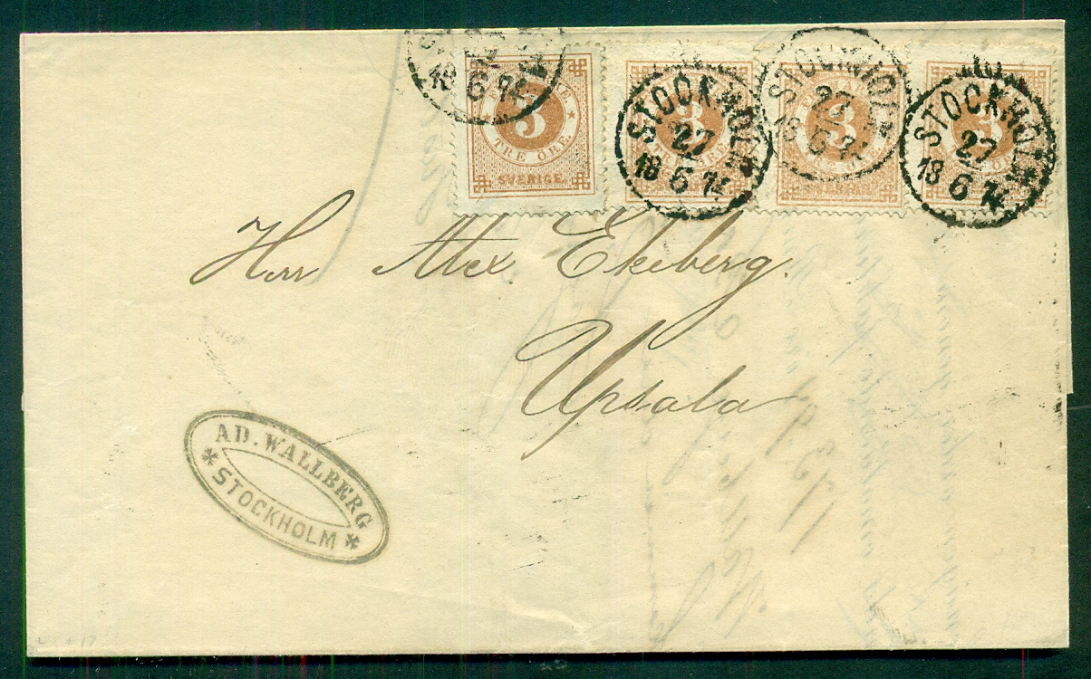 410W | 1874, Folded Letter with 3ore x 4 (#17) tied Stockholm to Upsala, VF, $95.00 | |