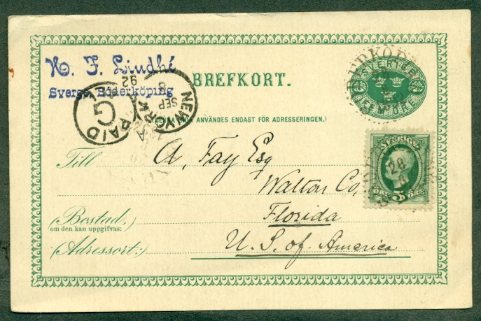 1892, 5ore card + 5ore to U.S., pricelist of Sweden stamps, reverse in longhand from dealer, VF, interesting, $50.00 |