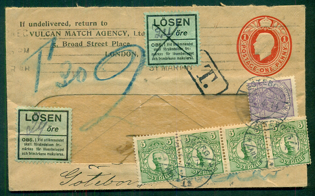| 411AE | 1885, Sweden Postage Dues on Germany parcel card from Giessen to Upsala, very pretty multiple franking, VF, $225.00 | ||